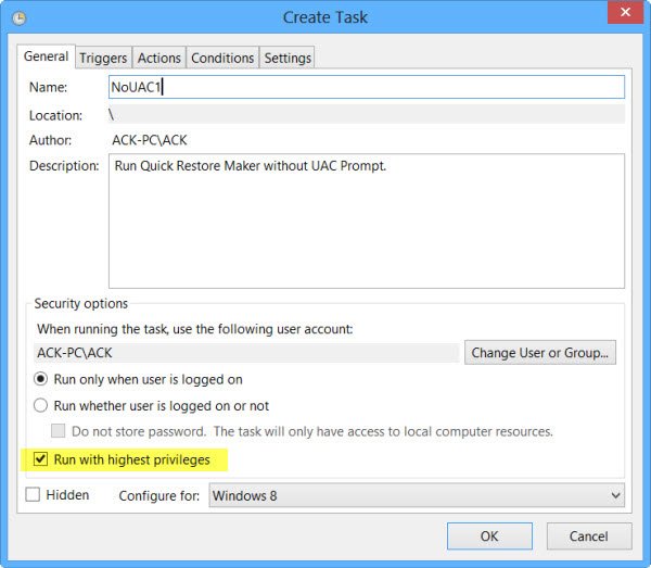 Under the General tab, requite the Task a name, say NoUAC1, complete the other fields as required and make sure that you check the Run with highest privileges box.